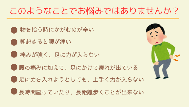 ・腰の痛みに加えて、足にかけて痺れが出ている。