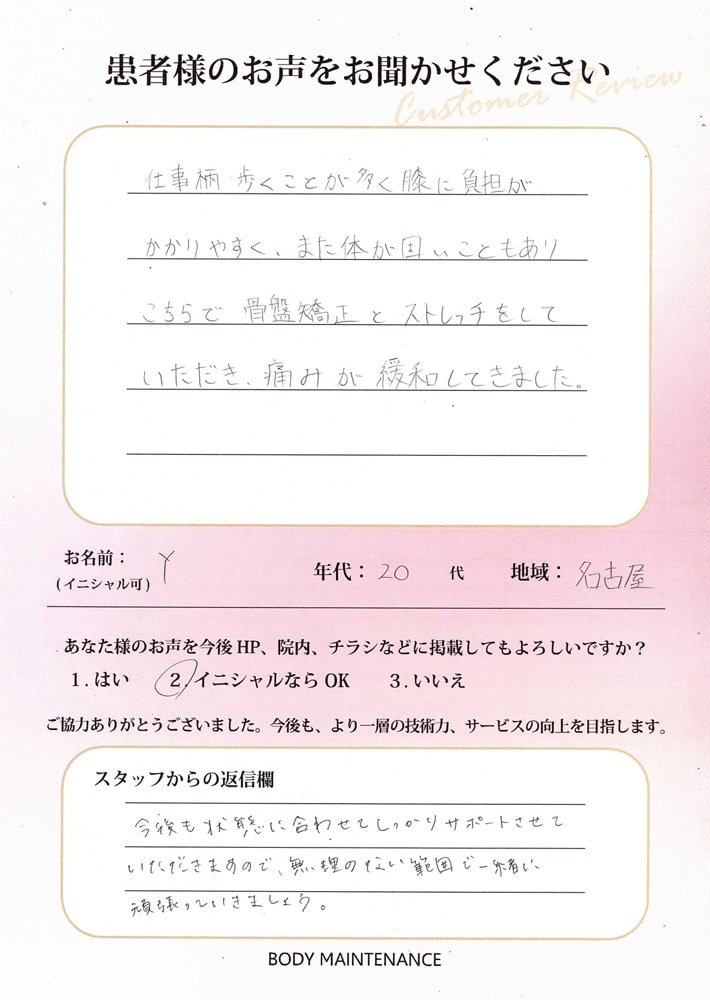 仕事柄、歩くことが多く膝に負担がかかりやすく、また体が固いこともあり、こちらで骨盤矯正とストレッチをしていただき痛みが緩和してきました。