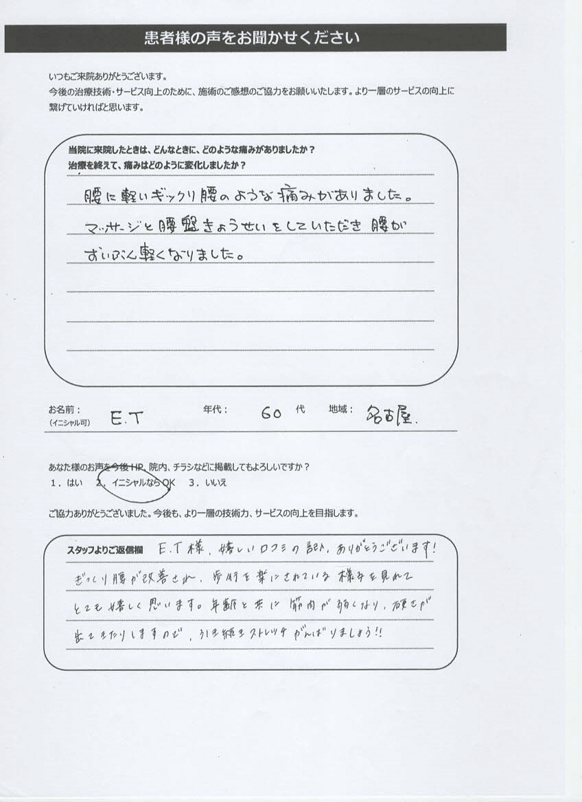 E.T様、嬉しい口コミの記入、ありがとうございます!ぎっくり腰が改善され、歩行を楽にされている様子を観れてとても嬉しく思います。年齢と共に筋肉が弱くなり、硬さが出てきたりしますので引き続きストレッチがんばりましょう!