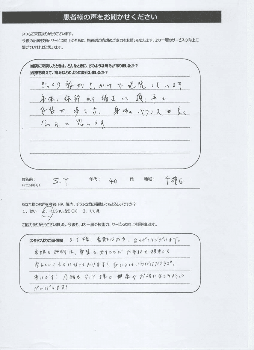 S.Y様、素敵なお声、ありがとうございます。当院の施術は骨盤を正すことでお身体を根本から変えていくものになっております!気に入っていただけたようで幸いです!今後もS.Y様の健康のお役に立てるようにがんばります!