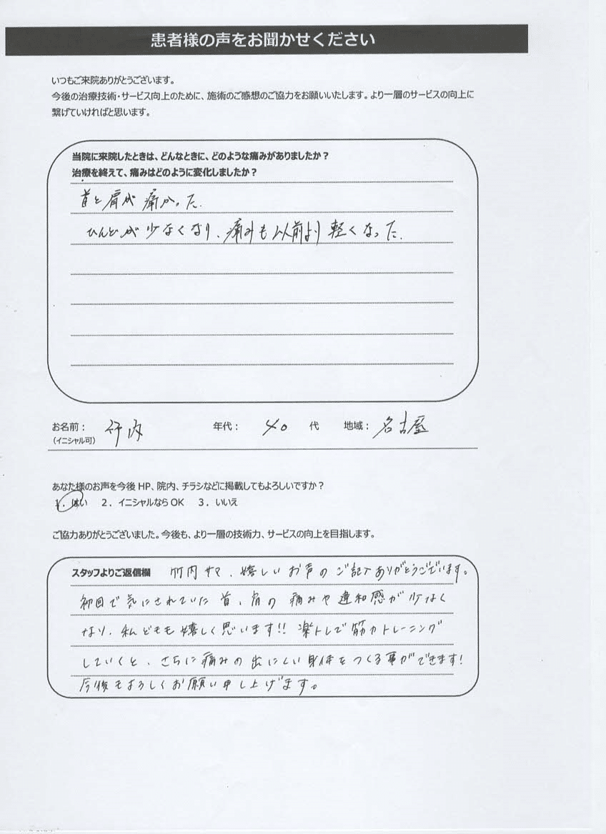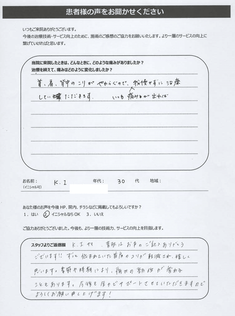 K.I様、素敵なお声のご記入ありがとうございます!ずっと悩まれていた首肩のコリが軽減され嬉しく思います。季節や時期により、痛みの部位が変わることもあります。今後も全力でサポートさせていただきますのでよろしくお願い申し上げます!