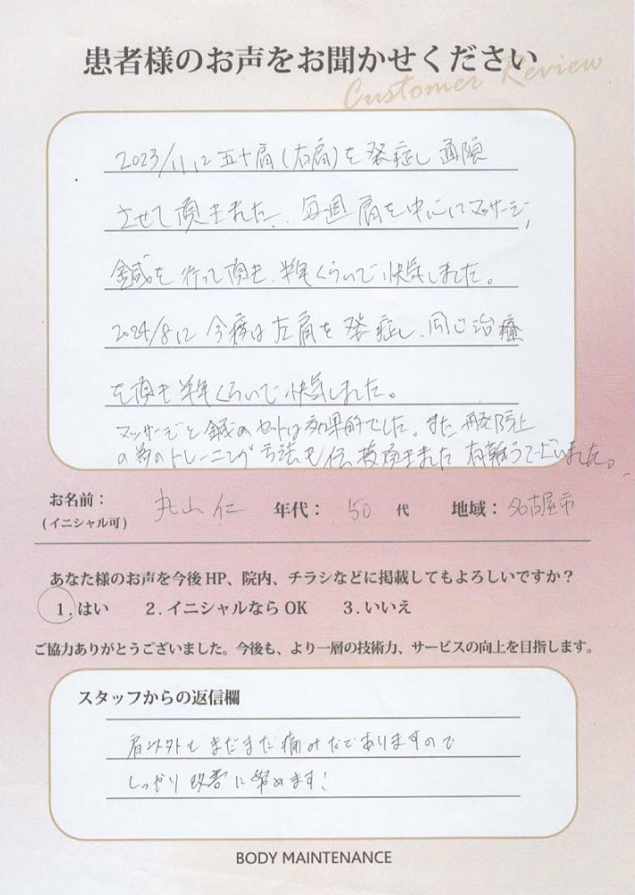 2023年11月に五十肩(右肩)を発症し通院させて頂きました。毎週、肩を中心にマッサージ・鍼を行って頂き半年くらいで快気しました。2024年8月に今度は左肩を発症し同じ治療を頂き半年くらいで快気しました。マッサージと鍼のセットは効果的でした。また再発防止の為のトレーニング方法も指導頂きました。ありがとうございました。