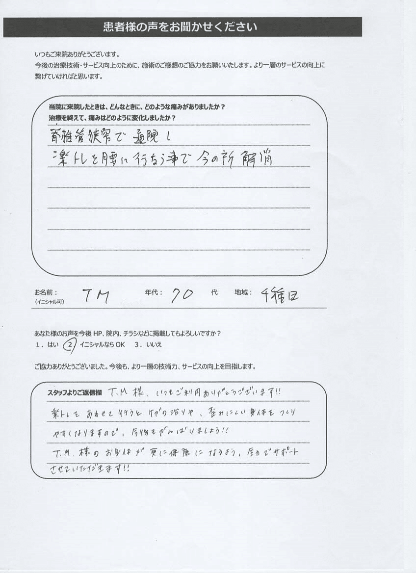 狭窄症だったことも忘れ、仕事上体を動かすことが多いですが毎日楽に働けています。いつもありがとうございます。※